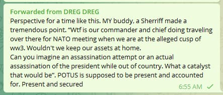 Seen online: "Wtf is our commander and chief doing traveling over there for NATO meeting when we are at the alleged cusp of ww3. Wouldn't we keep our assets at home. Can you imagine an assassination attempt or an actual assassination of the president while out of country. What a catalyst that would be. POTUS is supposed to be present and accounted for. Present and secured"